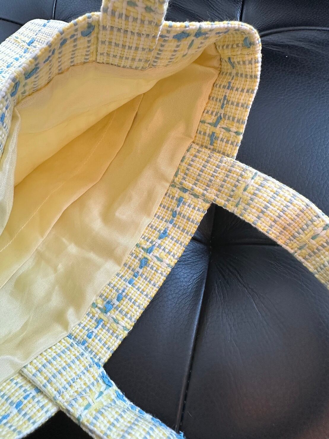 今年春夏のトレンドカラーでもあるイエロー。ブルーのラインが更にイエローの可愛さを引き立てますよね!表面もソリッドなデザインですので、夏らしく涼しげなツイードです。