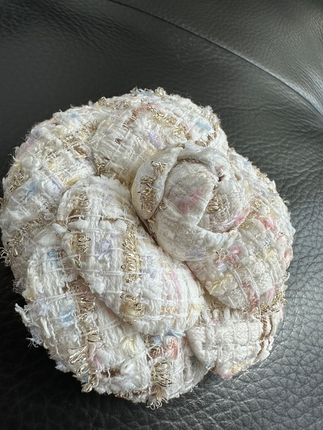 しっかりと立体的なカメリアはメゾンツイードと重なり合うことで高級感が溢れています。